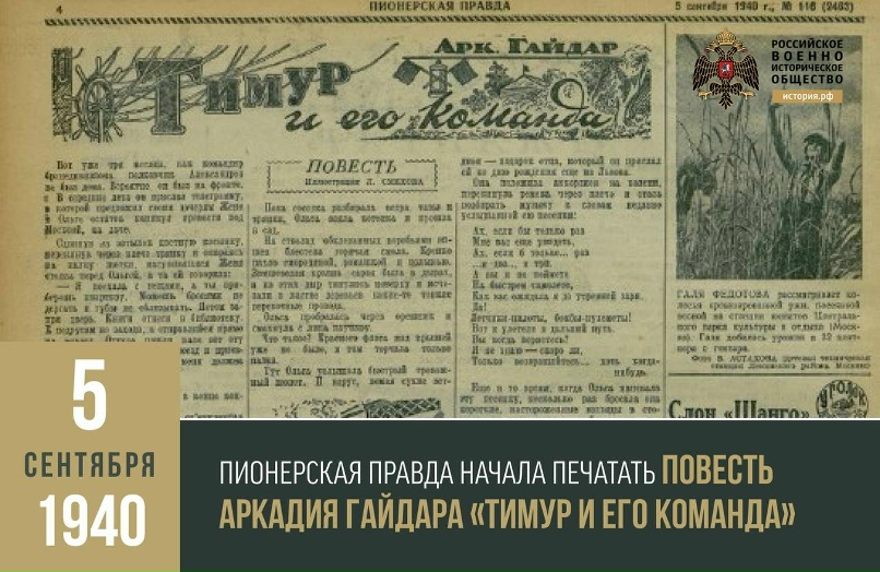 85 лет назад, 5 сентября 1940 года в газете «Пионерская правда» начали печатать повесть Аркадия Гайдара «Тимур и его команда».