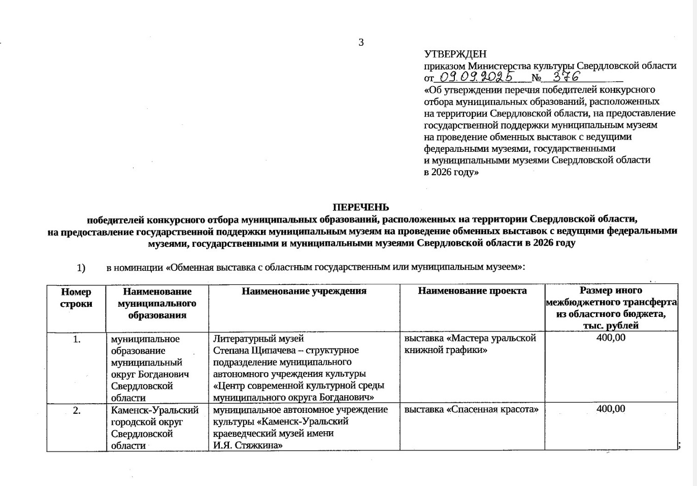 Музей получил субсидию на организацию обменной выставки с Ирбитским государственным музеем изобразительных искусств имени В.А. Карпова в размере 400 тысяч рублей.